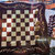 Walnut burl game table with a maple and mahogany inlaid chessboard and floral inlays around the playing area, with a turned central pedestal base.